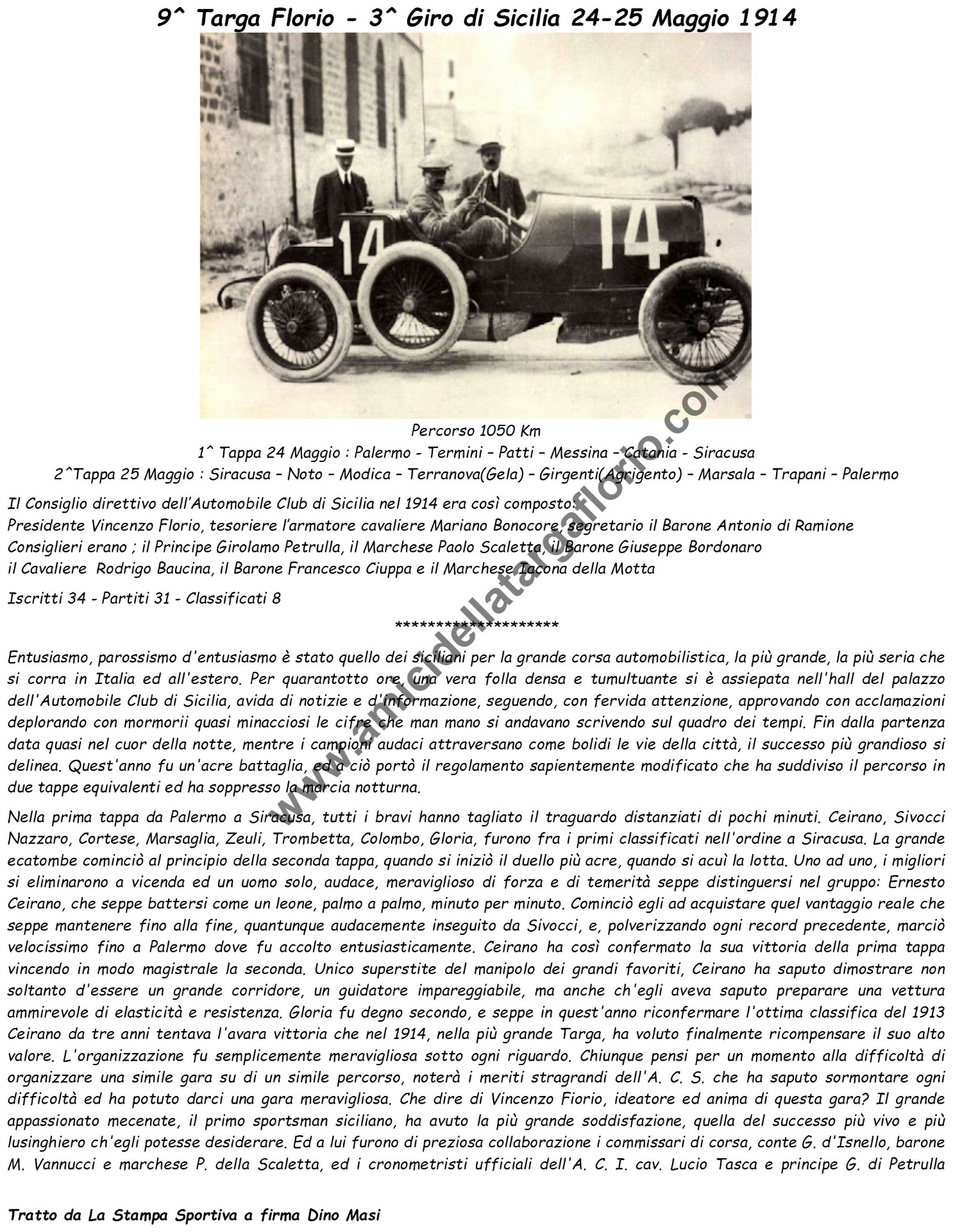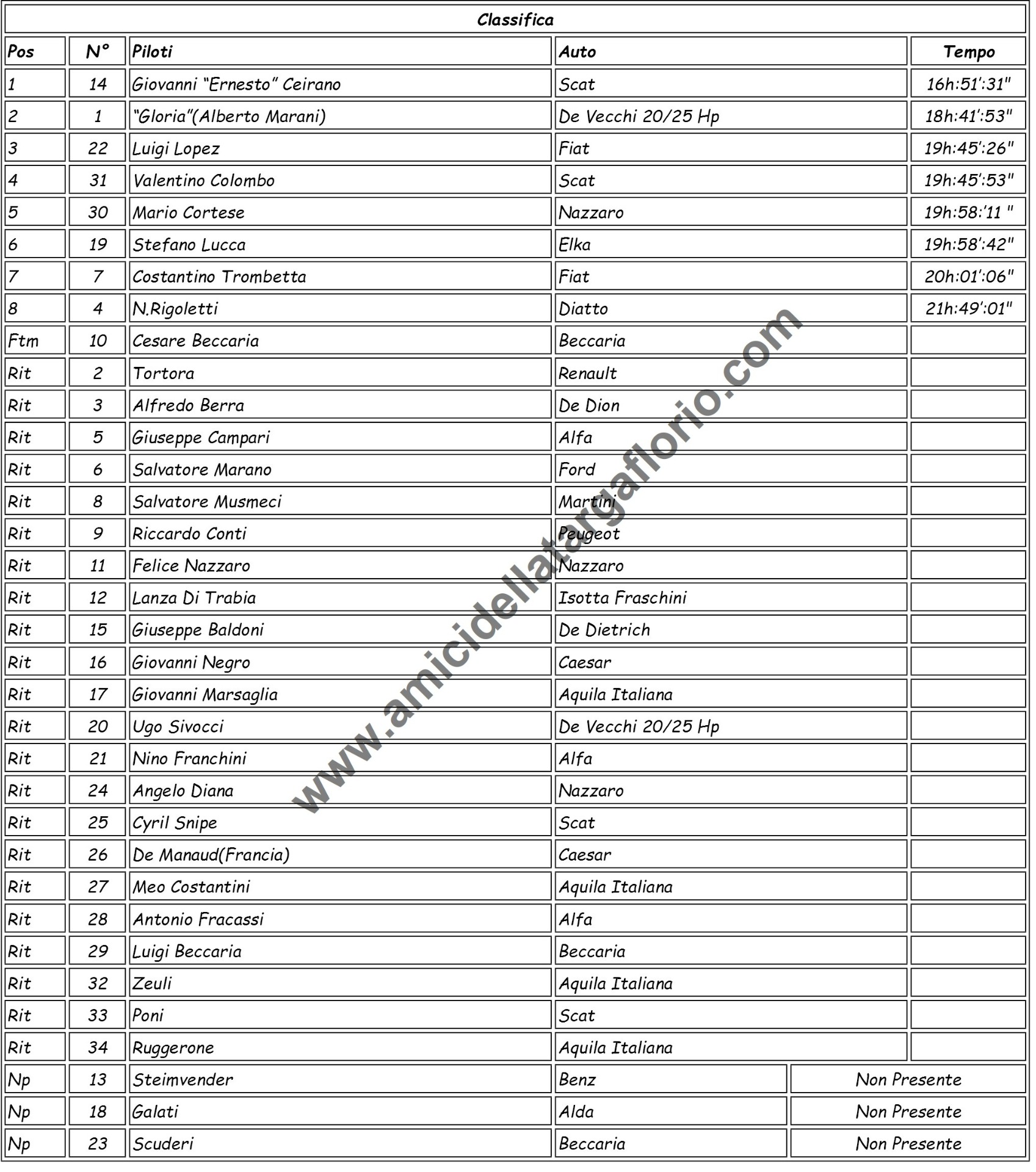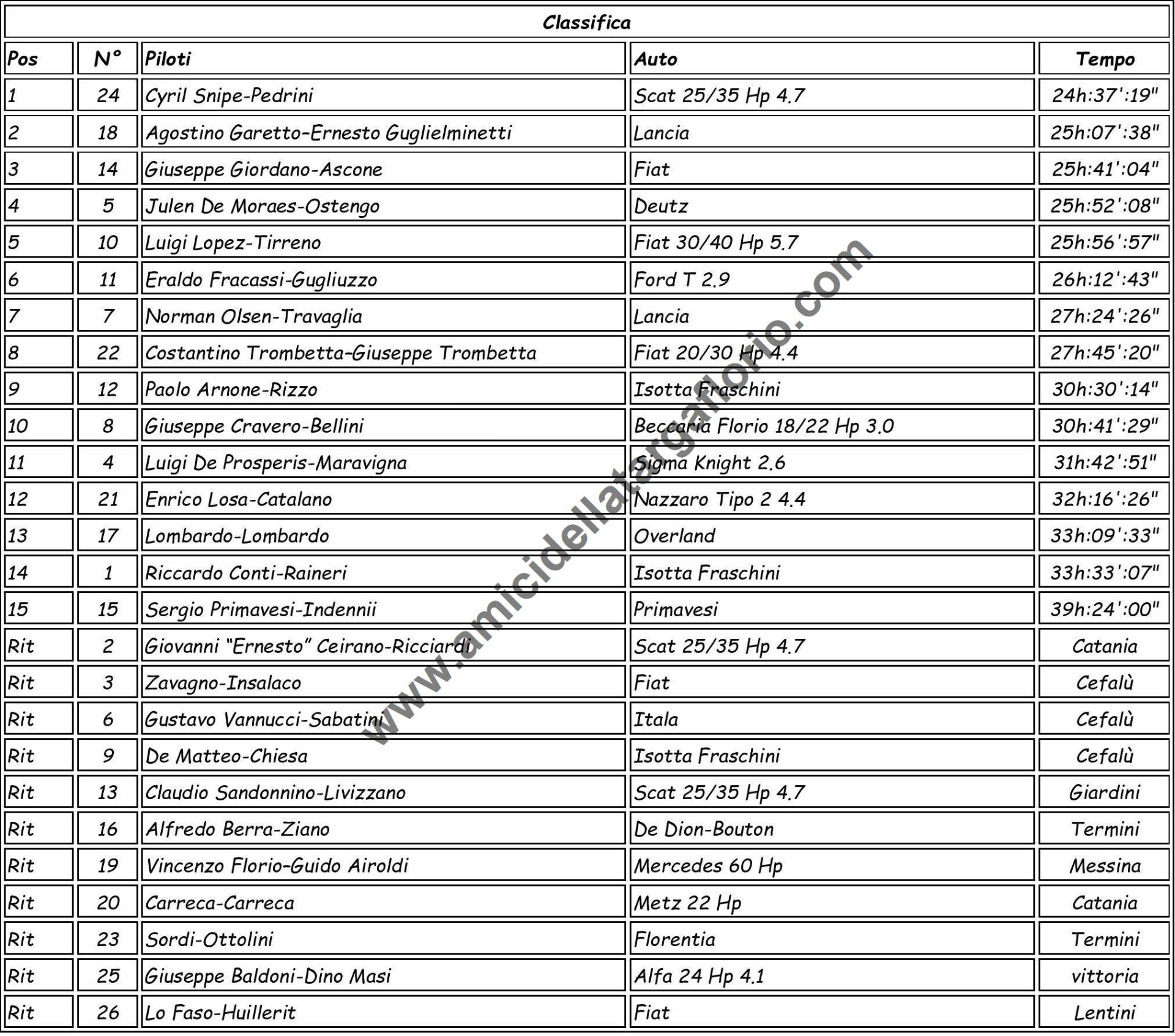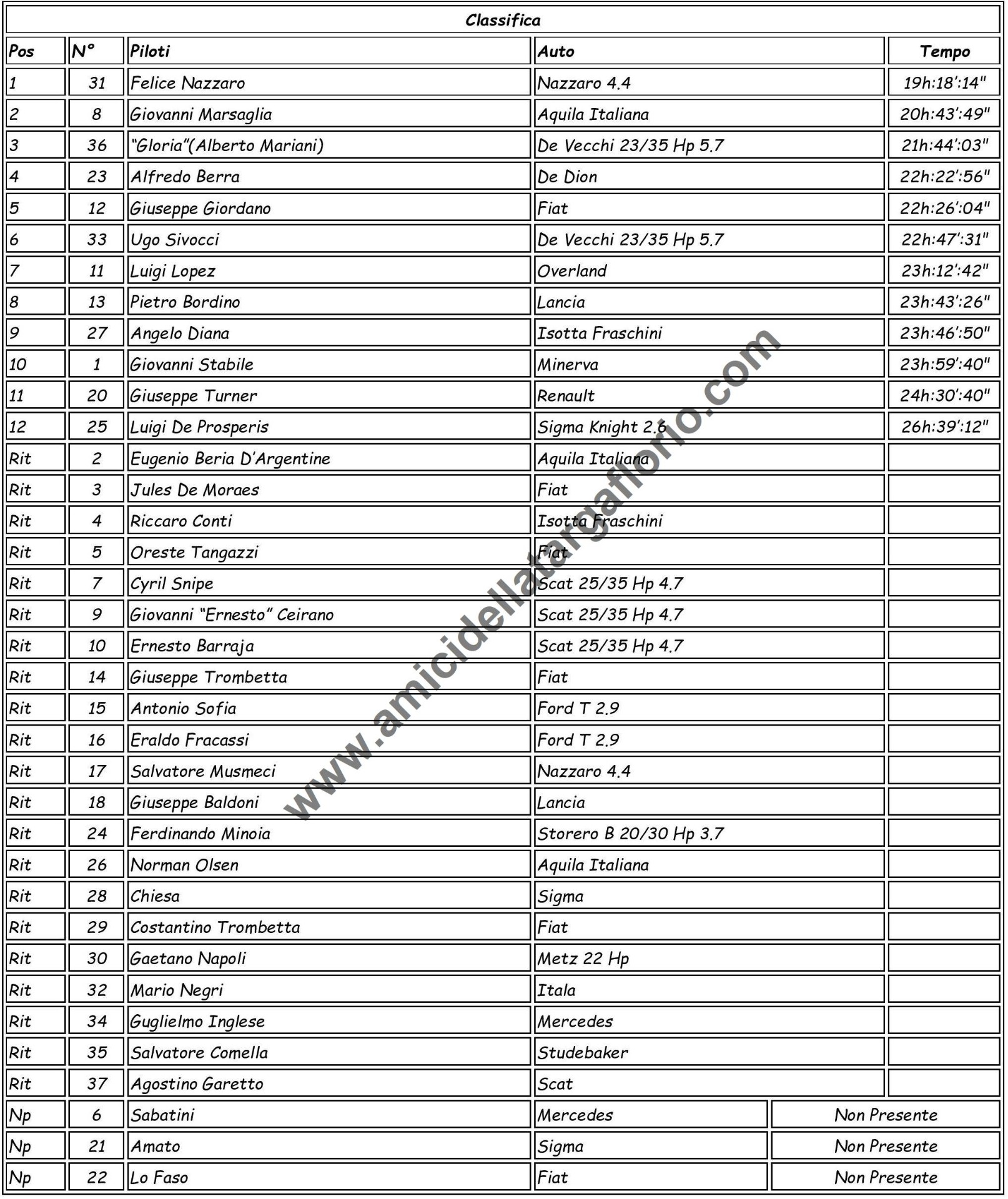 Per la ricostruzione delle classifiche le nostre fonti sono state : Raci – L'automobile – La Stampa – Annuari CSAI - La Stampa Sportiva – Il Littoriale – Il Giornale L'Ora- "Targa Florio Il Mito" di Giuseppe Valenza – "Targa Florio 1906-2006" di Gianfranco Mavaro , Sergio Mavaro ,Dario Lucchese – Corriere dello Sport – Rapiditas – Vari archivi fotografici - Giornale di Sicilia .