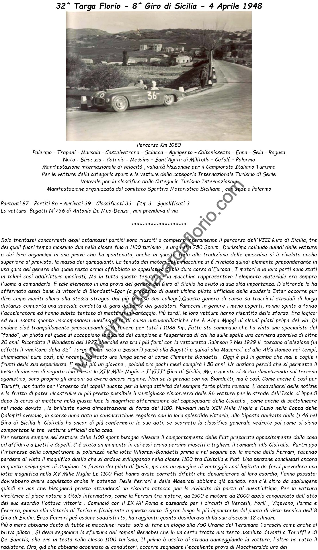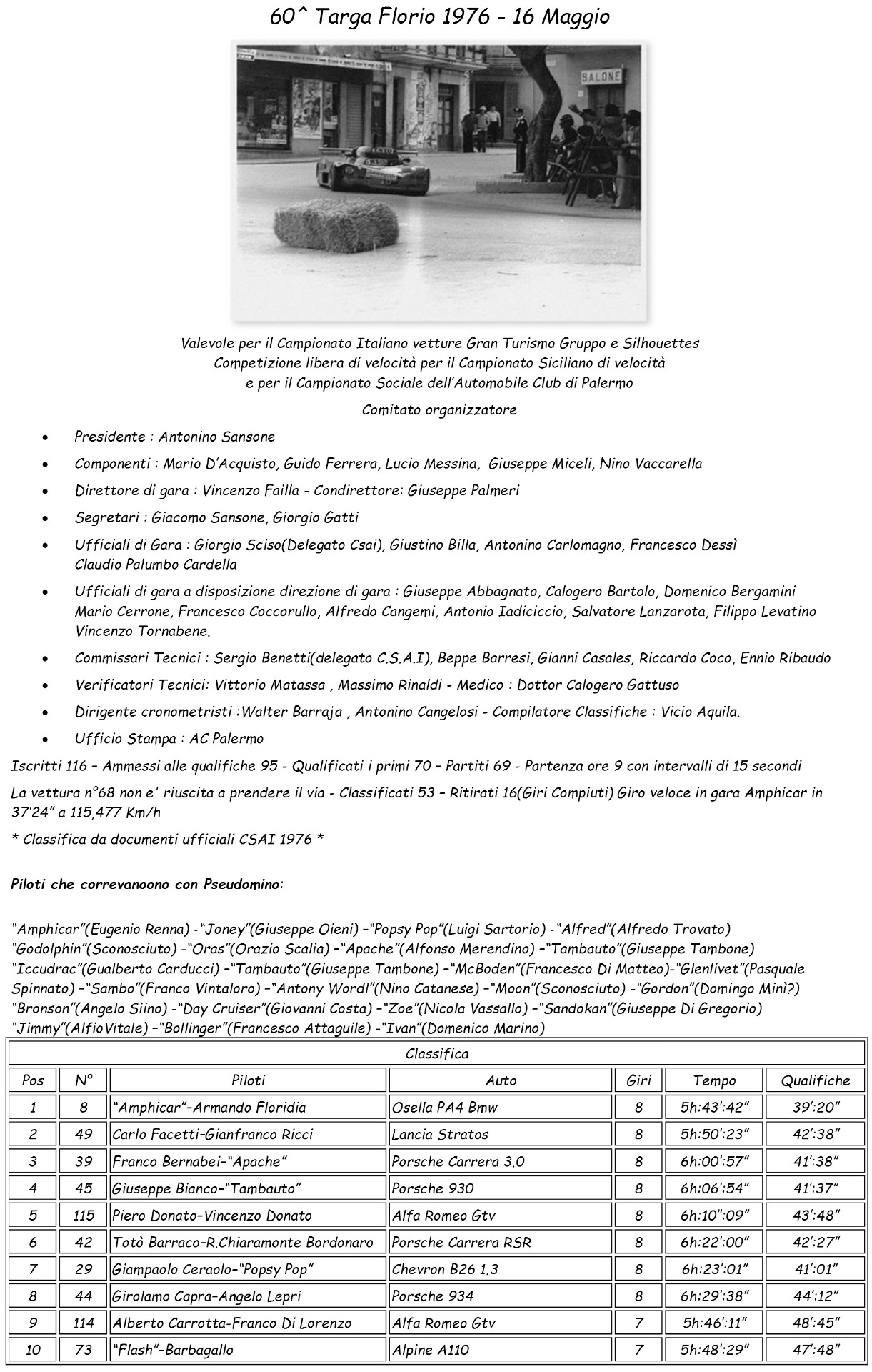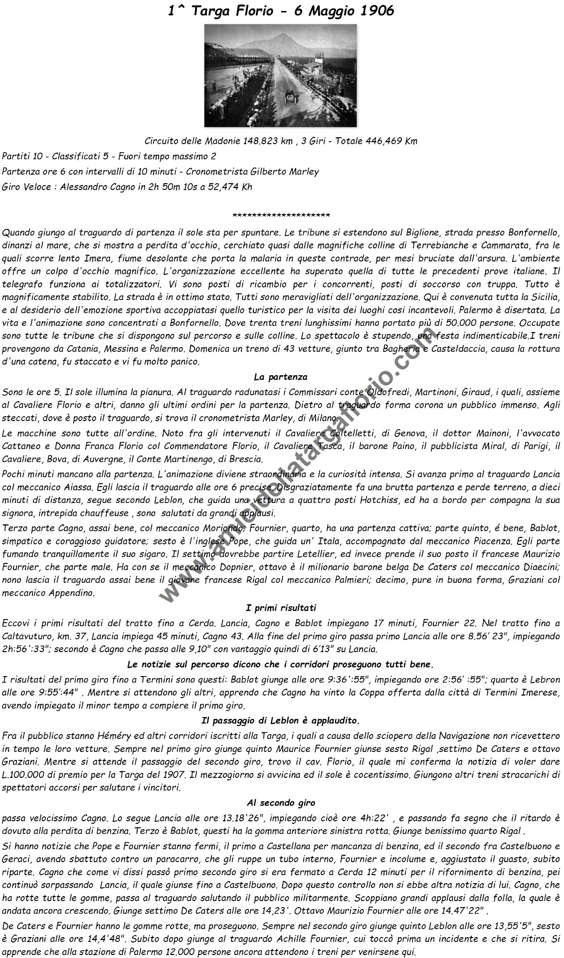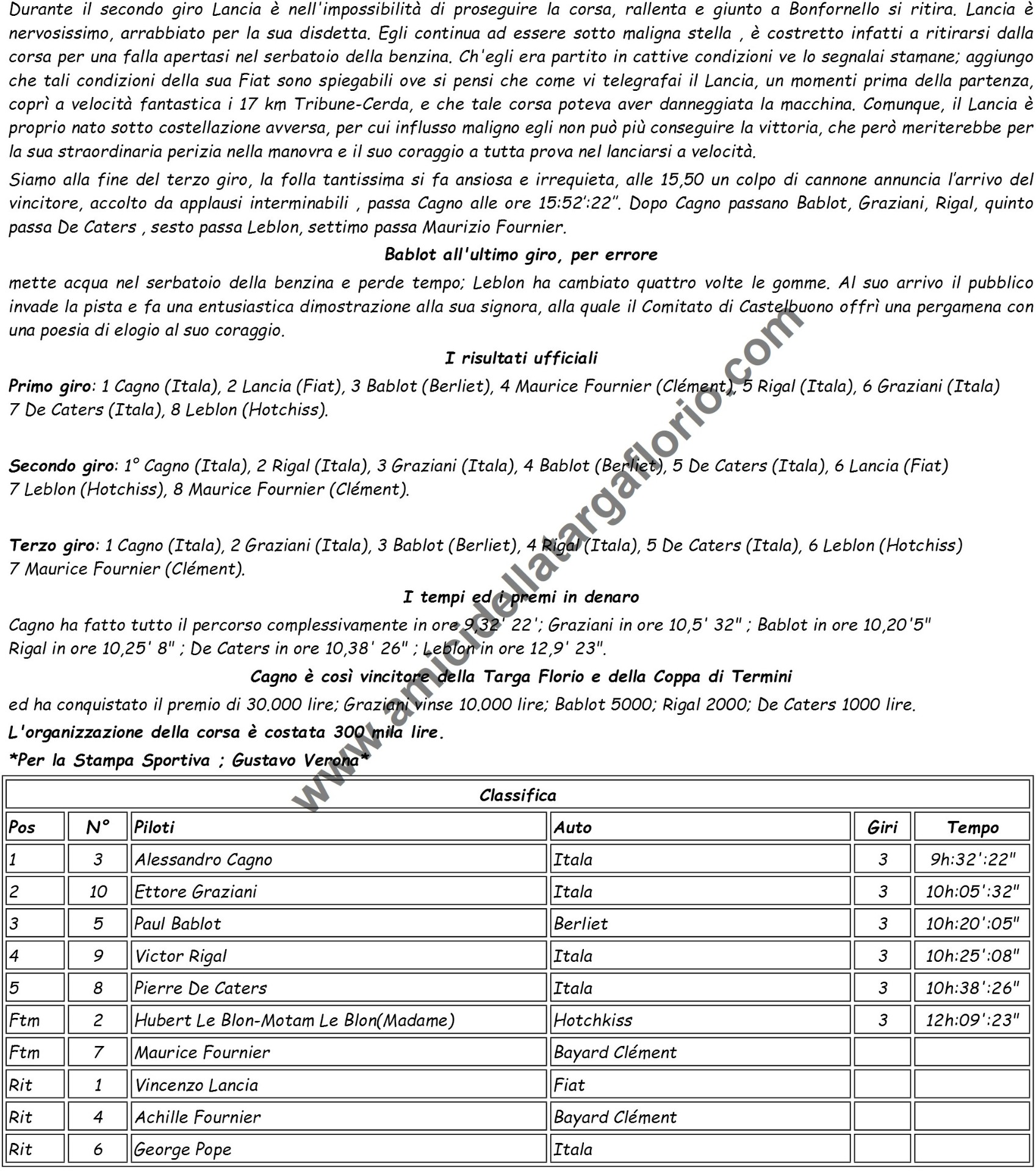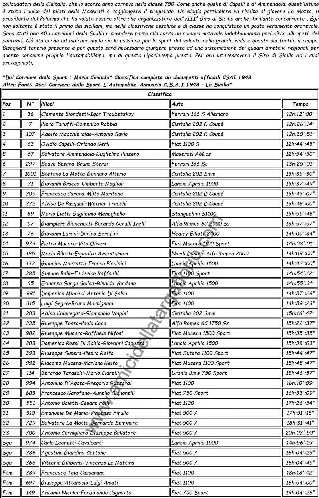 Per la ricostruzione delle classifiche le nostre fonti sono state : Raci – L'automobile – La Stampa – Annuari CSAI - La Stampa Sportiva – Il Littoriale – Il Giornale L'Ora- "Targa Florio Il Mito" di Giuseppe Valenza – "Targa Florio 1906-2006" di Gianfranco Mavaro , Sergio Mavaro ,Dario Lucchese – Corriere dello Sport – Rapiditas – Vari archivi fotografici - Giornale di Sicilia .